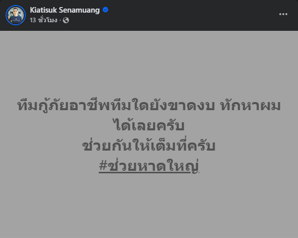 “ทีมกู้ภัยอาชีพทีมใดยังขาดงบ ทักหาผมได้เลยครับ ช่วยกันให้เต็มที่” พร้อมใส่แฮชแท็ก #ช่วยหาดใหญ่