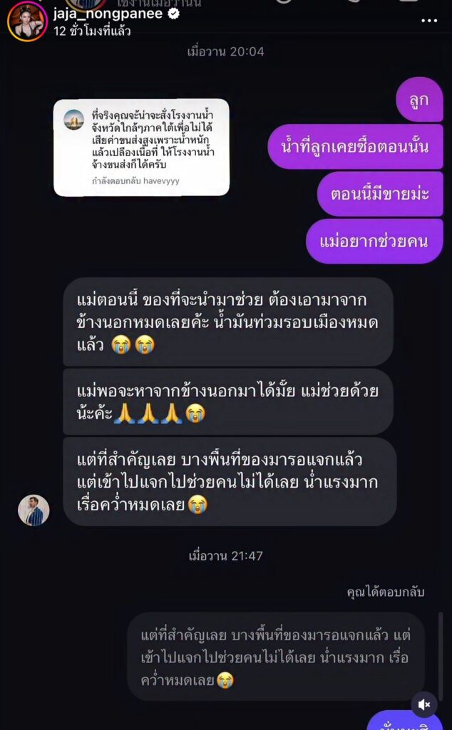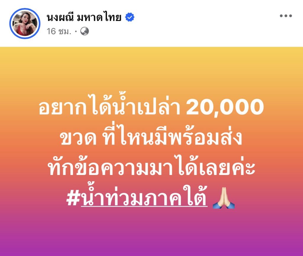 เช่นเดียวกับนักร้องสาว “จ๊ะ นงผณี” ได้ออกมาประกาศโพสต์ข้อความว่า “อยากได้น้ำเปล่า 20,000 ขวด ที่ไหนพร้อมส่ง ทักข้อความมาได้เลย #น้ำท่วมภาคใต้