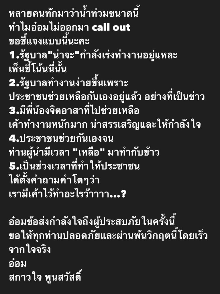 เรียกได้ว่าตอนนี้สถานการณ์น้ำท่วมทางภาคใต้วิกฤตอย่างมาก ประชาชนหลายครัวเรือนได้รับผลกระทบเสียหายหลางอย่าง ซึ่งทางด้านหลายภาคส่วนก็ได้ส่งความช่วยเหลือไปให้อย่างเร่งด่วน และได้ตั้งคำถามถึงการแก้ปัญหาของรัฐบาล ทางด้าน “อ๋อม สกาวใจ” ก็ได้ออกมาโพสต์ถึงเรื่องนี้เช่นกันโดยระบข้อความว่า “หลายคนทักมาว่าน้ำท่วมขนาดนี้ทำไมอ๋อมไม่ออกมา call out ขอชี้แจงแบบนี้นะคะ
