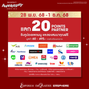 EM DISTRICT ANNIVERSARY UNSTOPPABLE HAPPINESS UNMISSABLE REWARDS มอบความพิเศษฉลองโอกาสครบรอบ 2 ปี พร้อมหลากหลายสิทธิพิเศษสุดเอ็กซ์คลูซีฟตลอด 4 วันเต็ม ระหว่างวันที่ 28 พฤศจิกายน 2568 – 1 ธันวาคม 2568 โดยการนำคะแนนจากพันธมิตรธุรกิจกว่า 23 พันธมิตรที่ร่วมแคมเปญ 20 คะแนน แลกรับของสมนาคุณ หรือเมนูฟรีจากร้านอาหารชั้นนำในศูนย์การค้ามากมาย”