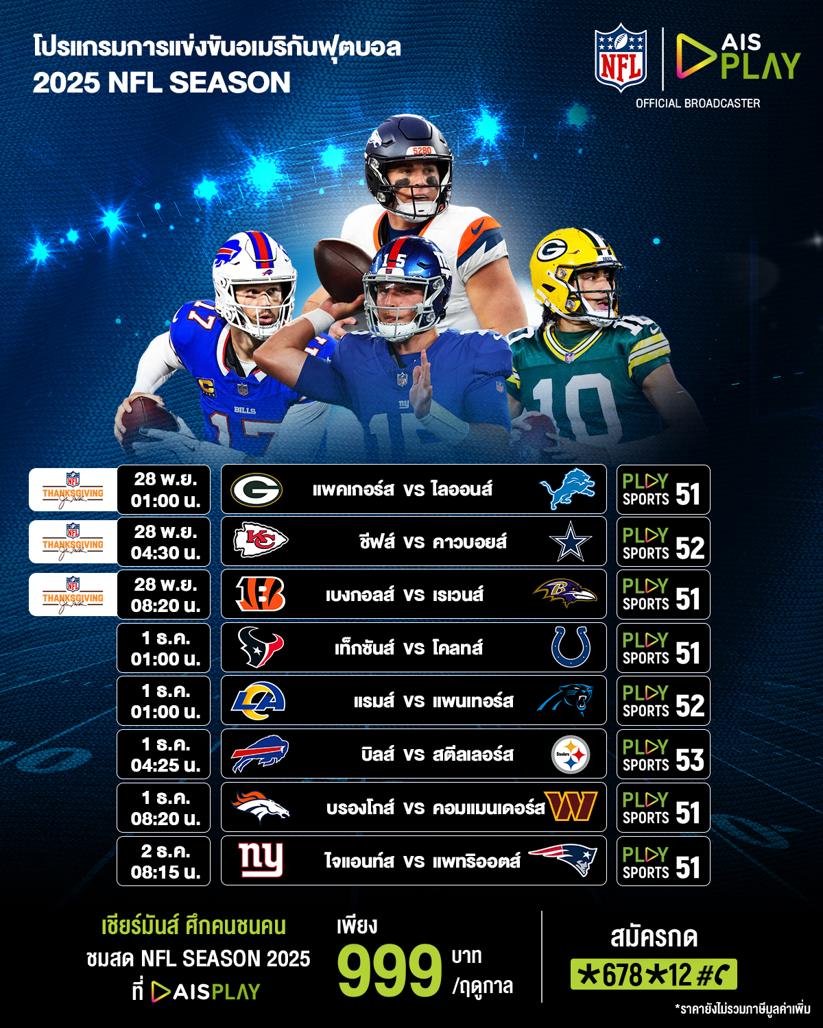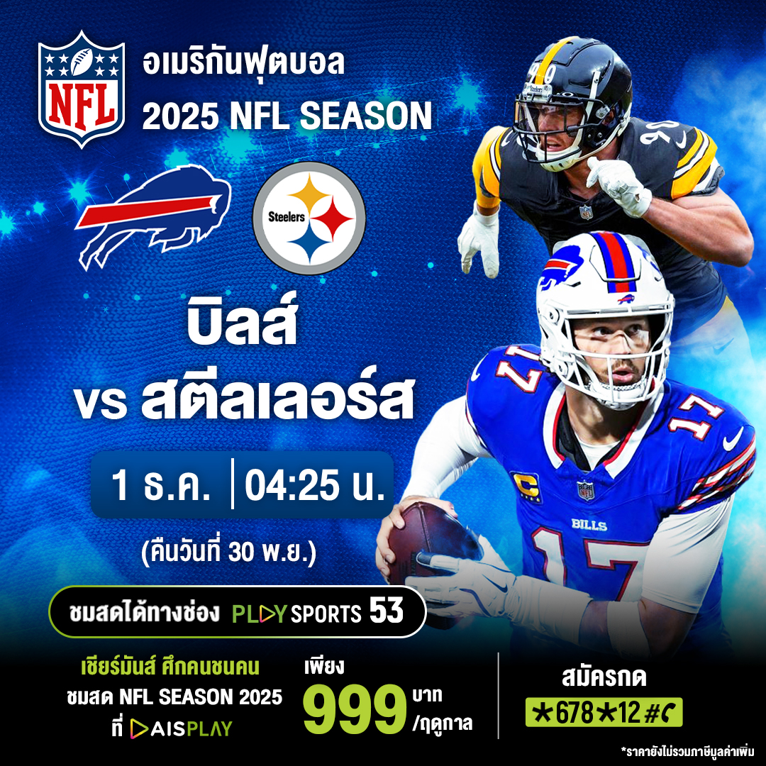 AIS PLAY ส่งตรงความมันส์ระดับโลก! ถ่ายทอดสดศึก NFL ฤดูกาล 2025/26 ให้ชมตลอดซีซั่น พร้อมแมตช์สำคัญประจำ สัปดาห์ที่ 13 แฟนกีฬาอเมริกันฟุตบอลไม่ควรพลาด! รับชมได้ง่าย ๆ ด้วยซีซั่นพาส เพียง 999 บาท