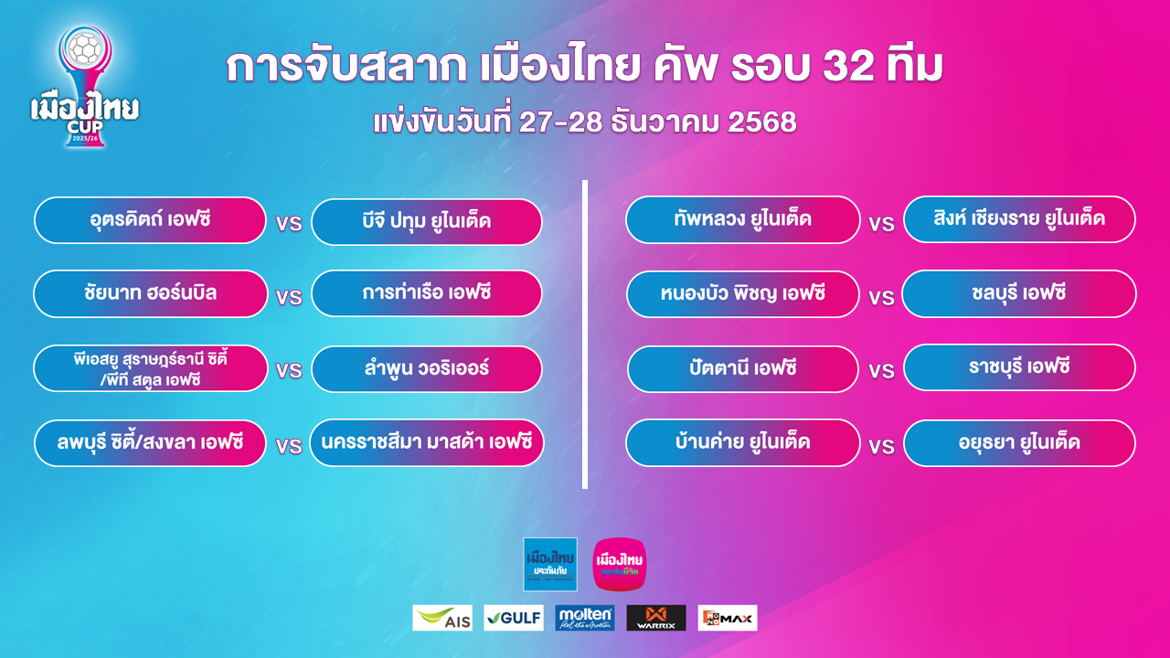 วันที่ 28 พฤศจิกายน 2568 เวลา 14.00 น. ณ. ห้องประชุมเมืองไทยประกันภัย อาคารเมืองไทยภัทร คอมเพล็กซ์ “Tower A” ชั้น 14 สมาคมกีฬาฟุตบอลแห่งประเทศไทยฯ จัดพิธีจับสลากประกบคู่การแข่งขันฟุตบอล เมืองไทย คัพ ฤดูกาล 2025/26 รอบ 32 ทีม