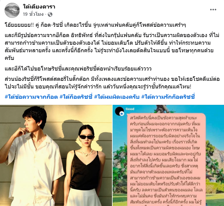 เรียกได้ว่าถูกจับตามองอย่างมากสำหรับพระเอกหนุ่ม “ก็อต อิทธิพัทธ์” ที่ได้ออกมาเปิดเผยถึงความสัมพันธ์ในกลุ่มแฟนคลับถึงสาว “ริชชี่ อรเณศ” ว่าได้เลิกรากันแล้ว พร้อมทั้งยอมรับความผิด และขอโทษทางด้านฝ่ายหญิงด้วย ซึ่งคนในสังคมตั้งคำถามถึงสาเหตุที่ทำให้เลิกรากันว่าเป็นเพราะเหตุใด จึงเกิดการคาดเดากันไปต่างๆ นานา