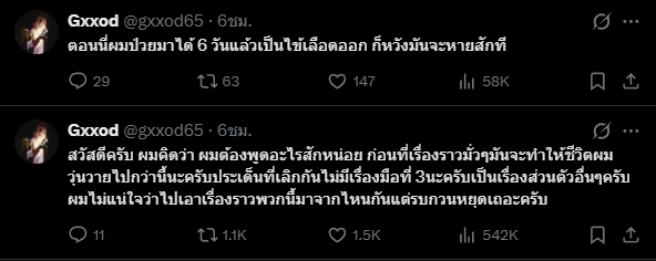 ขณะเดียวกัน “ก็อต” ก็ได้มาเผยถึงอาการป่วยว่า “ตอนนี่ผมป่วยมาได้ 6 วันแล้วเป็นไข้เลือดออก ก็หวังมันจะหายสักที” งานนี้แฟนๆจึงได้เข้ามาส่งกำลังใจให้อย่างมากมาย