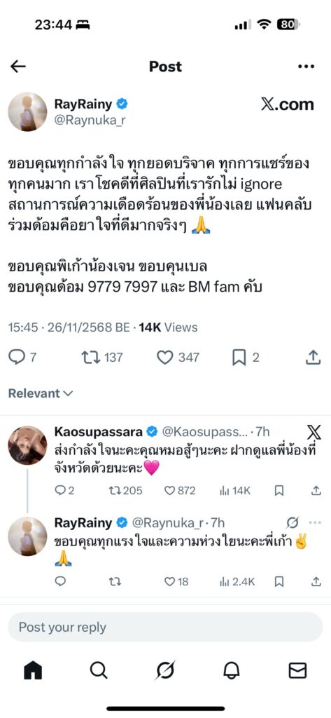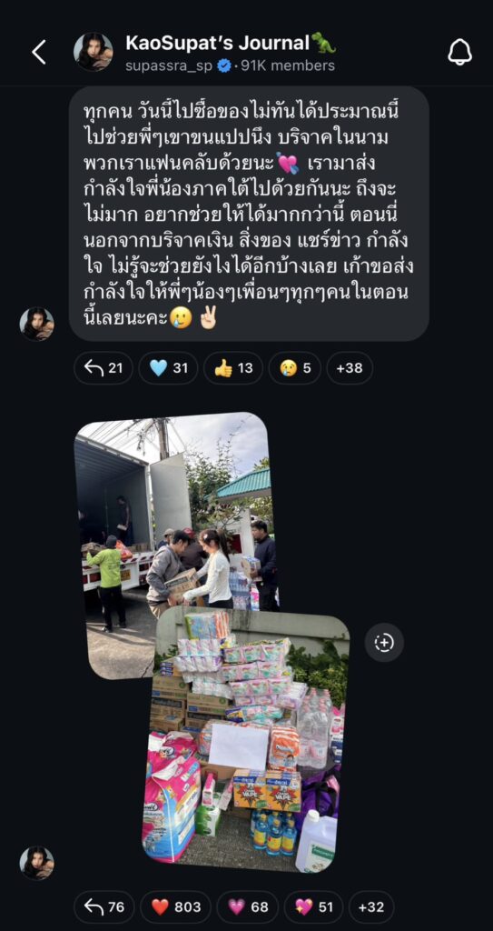 ไม่เพียงเท่านั้น เก้า ยังจัดส่งของบริจาคเลือกซื้อเลือกของใช้จำเป็นด้วยตัวเอง ใช้ชื่อแฟนคลับ “ด้อม 9779” มาร่วมบุญด้วยกัน เพื่อช่วยเหลือผู้ประสบภัยที่หาดใหญ่ และสตูล โดยได้มีการส่งมอบสิ่งของบริจาคที่ LOOKE ซอยนวมินทร์ 40 เพื่อเตรียมส่งต่อไปยังพื้นที่ที่ได้รับความเดือดร้อนอีกด้วย พร้อมเผยข้อความใน Official ส่วนตัวว่า ตนและแฟนคลับขอส่งต่อกำลังใจและทรัพยากรที่จำเป็นไปสู่พี่น้องชาวใต้เพื่อให้ผ่านพ้นวิกฤตครั้งนี้ไปได้โดยเร็ว