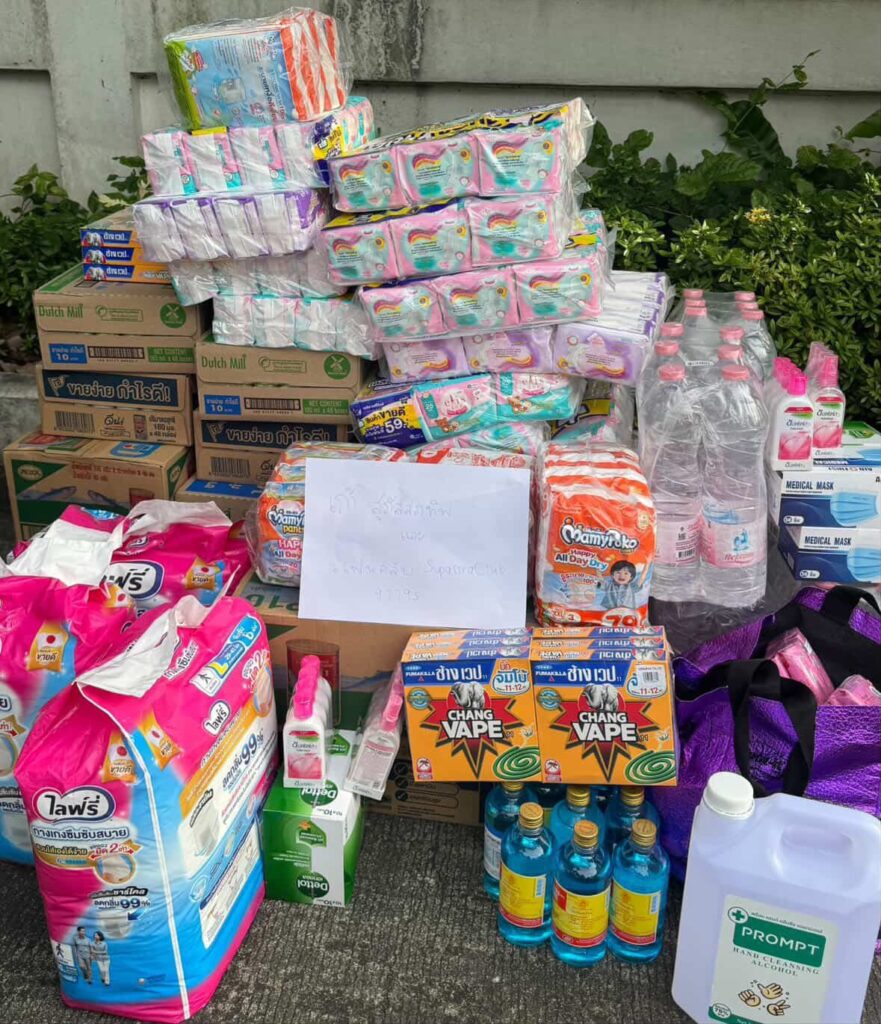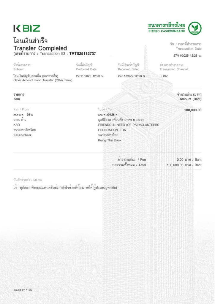 * มูลนิธิอาสาเพื่อนพึ่ง (ภาฯ) ยามยาก สภากาชาดไทย จำนวน 100,000 บาท เพื่อนำไปจัดทำถุงยังชีพและช่วยเหลือฟื้นฟูผู้ประสบอุทกภัย