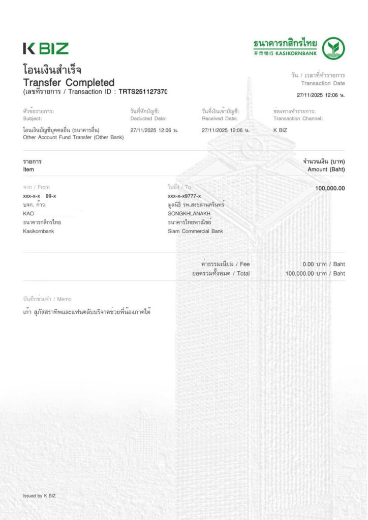 * มูลนิธิโรงพยาบาลสงขลานครินทร์ จำนวน 100,000 บาท เพื่อสนับสนุนทางการแพทย์และการช่วยเหลือฉุกเฉินในพื้นที่