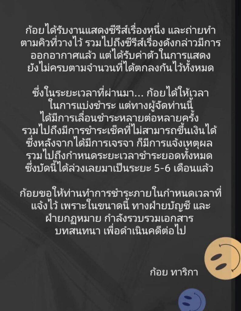 โดยล่าสุด ทางด้าน “แม่ก้อย ทาริกา“ ถือเป็นหนึ่งคนในวงการ ที่ออกมาประกาศทวงเงินกับผู้จัดซีรีส์ท่านหนึ่ง หลังซีรีส์ถ่ายเสร็จและออกมาอากาศเรียบร้อยแต่ยังได้รับเงินไม่ครบจำนวน ซึ่งโพสต์ข้อความลงไอจีที่เขียนว่า