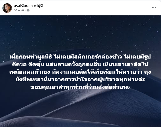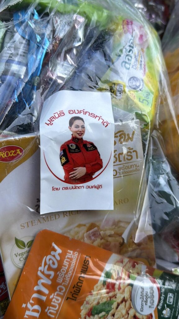 ”เมื่อก่อนทำมูลนิธิ ไม่เคยมีสติกเกอร์กล่องข้าว ไม่เคยมีรูปติดรถ ติดซุ้ม แต่หลายครั้งถูกคนอื่น เนียนเอาเครดิตไปเหมือนทุนตัวเอง ทีมงานเลยติดไว้เพื่อเรียนให้ทราบว่า ถุงยังชีพเหล่านี้มาจากธารน้ำใจจากผู้บริจาคทุกท่านค่ะ ขอบคุณอาสาทุกท่านที่ร่วมส่งต่อด้วยนะ”  งานนี้แฟนคลับและชาวเน็ตได้แห่เข้ามาชื่นชมกันจำนวนมาก