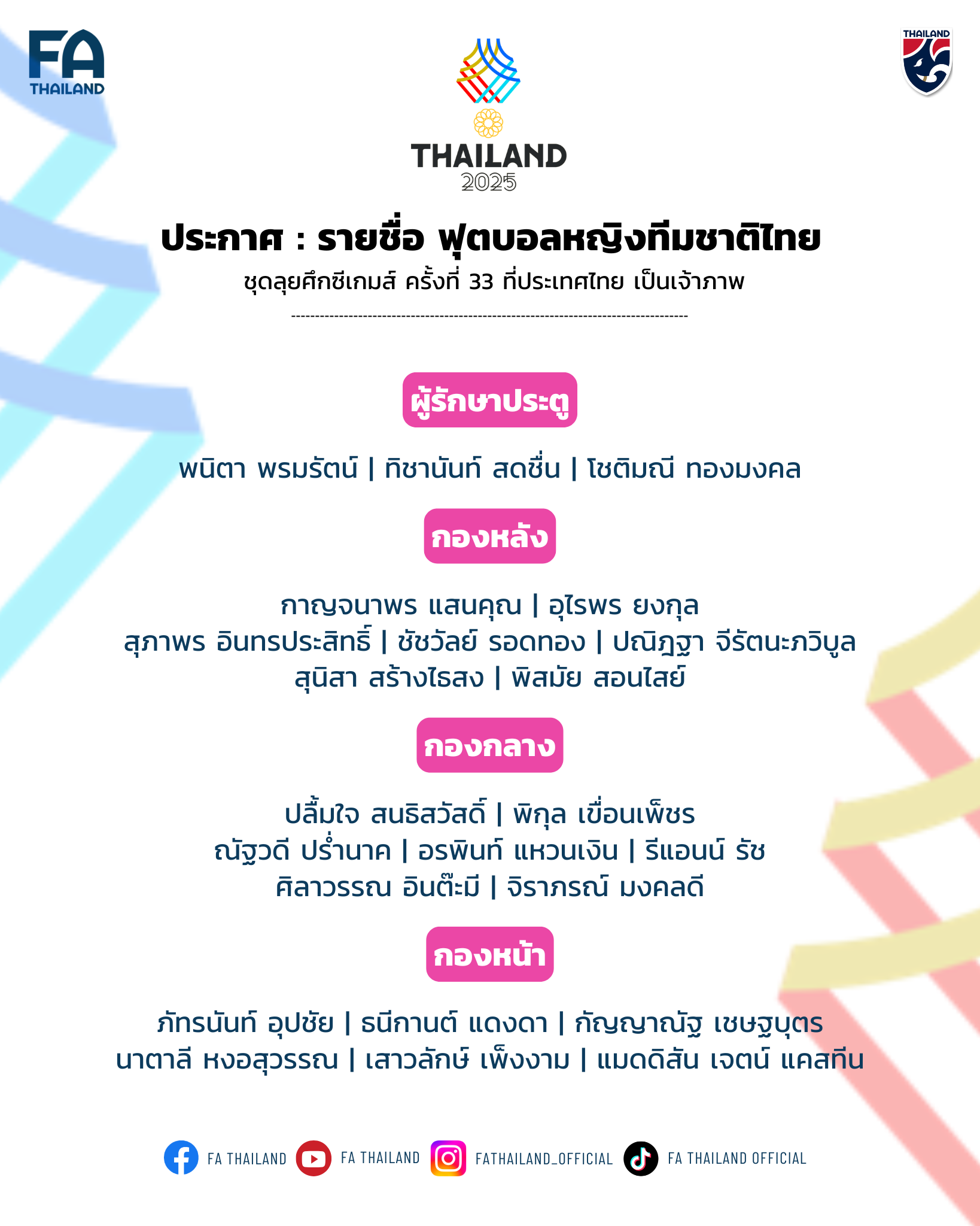สมาคมกีฬาฟุตบอลแห่งประเทศไทย ในพระบรมราชูปถัมภ์ ประกาศรายชื่อ 23 นักฟุตบอลหญิงทีมชาติไทย ชุดทำการแข่งขันมหกรรมกีฬาซีเกมส์ ครั้งที่ 33 ที่ประเทศไทยเป็นเจ้าภาพ ระหว่างวันที่ 4-17 ธันวาคม 2568 ณ ชลบุรี สเตเดียม ภายใต้การคุมทัพของ “โค้ชหนึ่ง” หนึ่งฤทัย สระทองเวียน หัวหน้าผู้ฝึกสอน