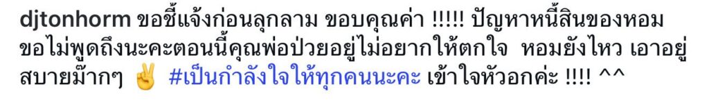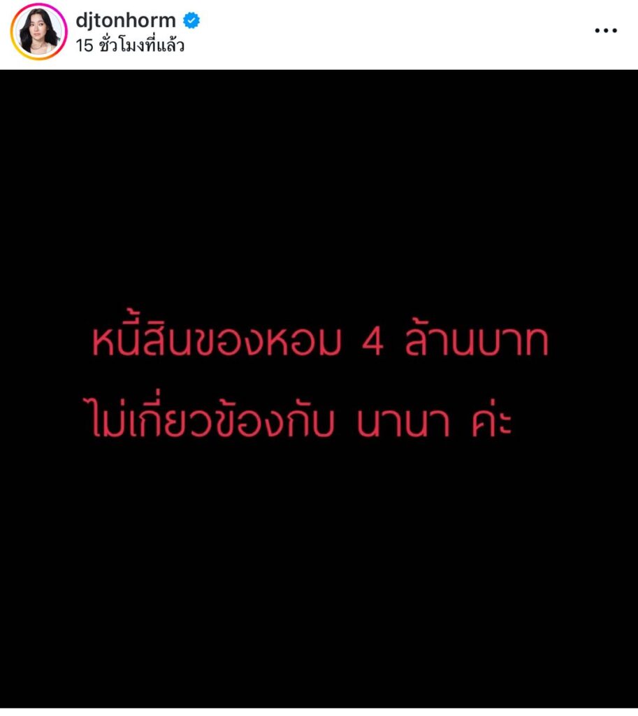 ล่าสุดทำให้ “ต้นหอม” ต้องรีบออกมาชี้แจงด่วน โดยโพสต์ผ่านไอจีเป็นภาพที่เขียนว่า”หนี้สินของหอม4ล้านบาท ไม่เกี่ยวข้องกับ นานา ค่ะ “ พร้อมยังเขียนแคปชั่นว่า “ขอชี้แจ้งก่อนลุกลาม ขอบคุณค่า !!!!! ปัญหาหนี้สินของหอมขอไม่พูดถึงนะคะตอนนี้คุณพ่อป่วยอยู่ไม่อยากให้ตกใจ หอมยังไหว เอาอยู่ สบายม๊ากๆ ✌️ #เป็นกำลังใจให้ทุกคนนะคะ เข้าใจหัวอกค่ะ !!!! “ ท่ามกลางชาวเน็ตเข้ามาคอมเมนต์ให้กำลังใจสู้ๆสาว “ต้นหอม” กันอล่างล้นหลาม