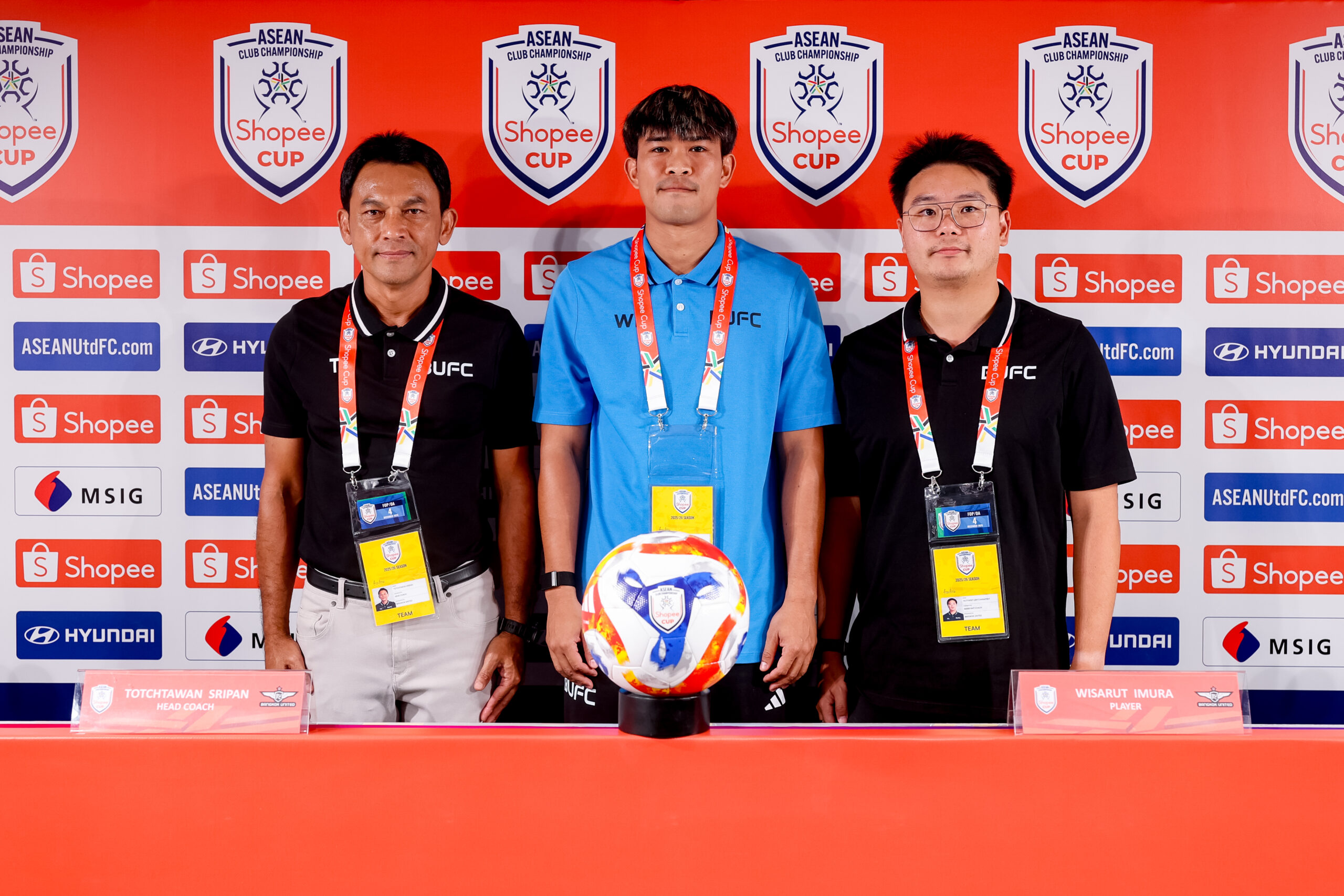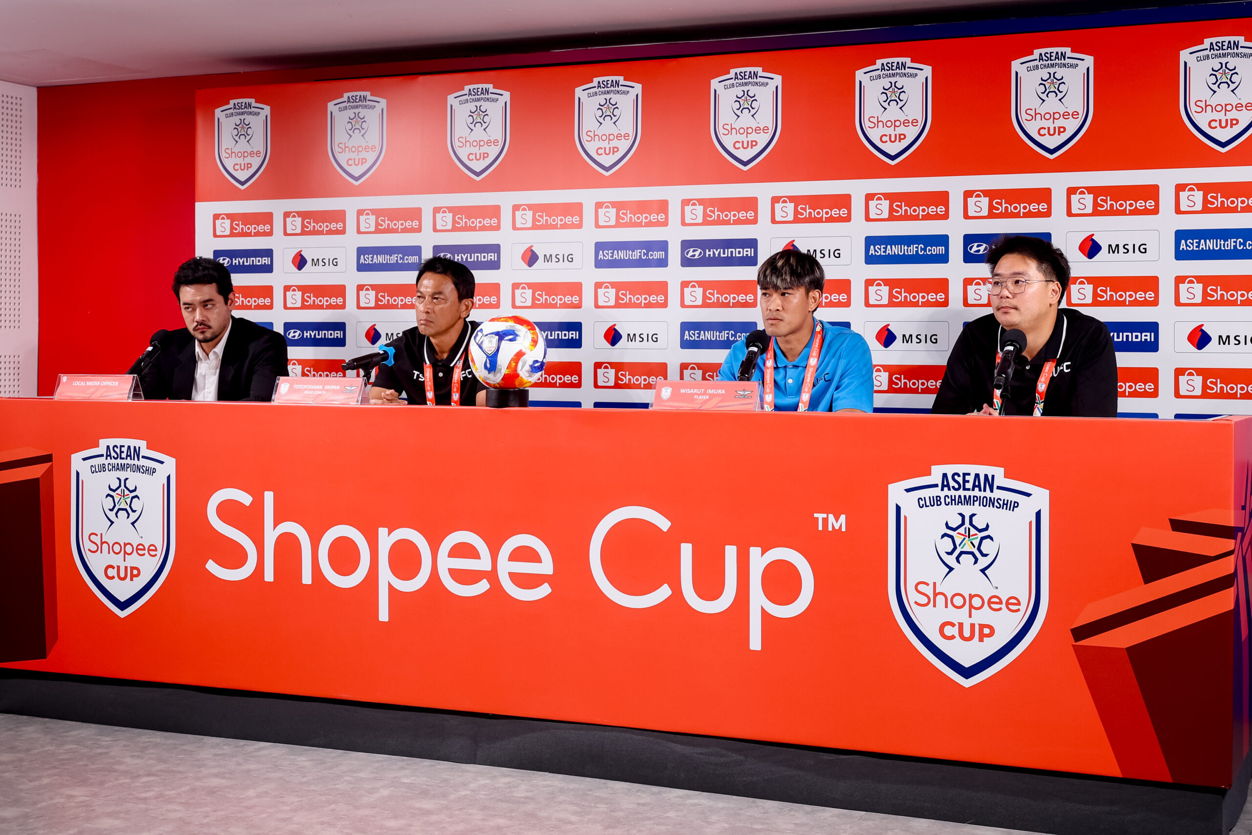 ณ ห้องแถลงข่าวสนาม ทรู บีจี สเตเดี้ยม “โค้ชแบน” ธชตวัน ศรีปาน และ วิศรุต อิ่มอุระ ร่วมแถลงข่าวก่อนเกมการแข่งขันฟุตบอลชิงแชมป์สโมสรอาเซียน 2025/26 รอบแบ่งกลุ่ม นัดที่สอง พบ ไลออน ซิตี้ เซเลอร์ส ในวันพรุ่งนี้