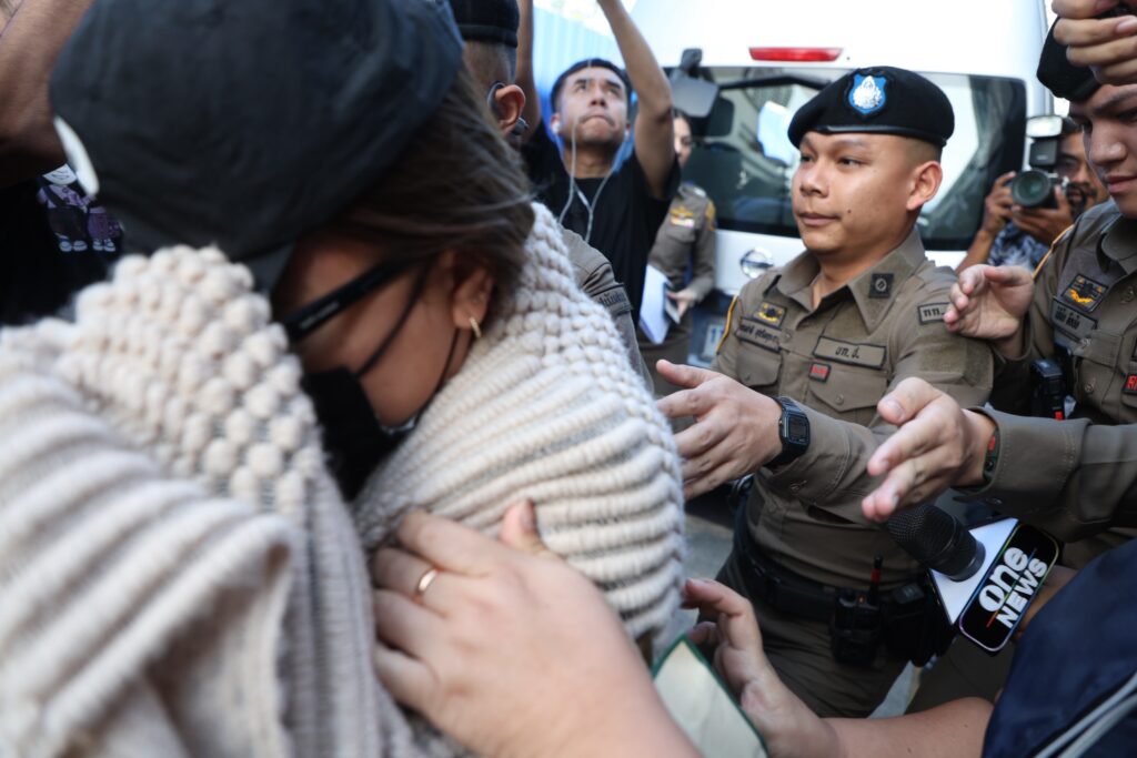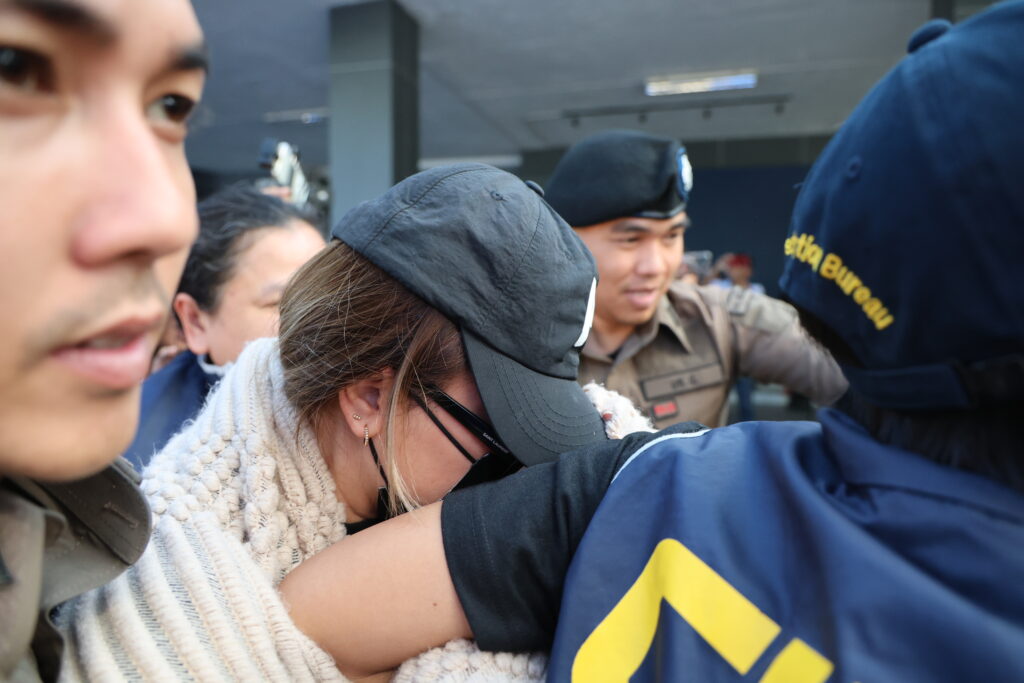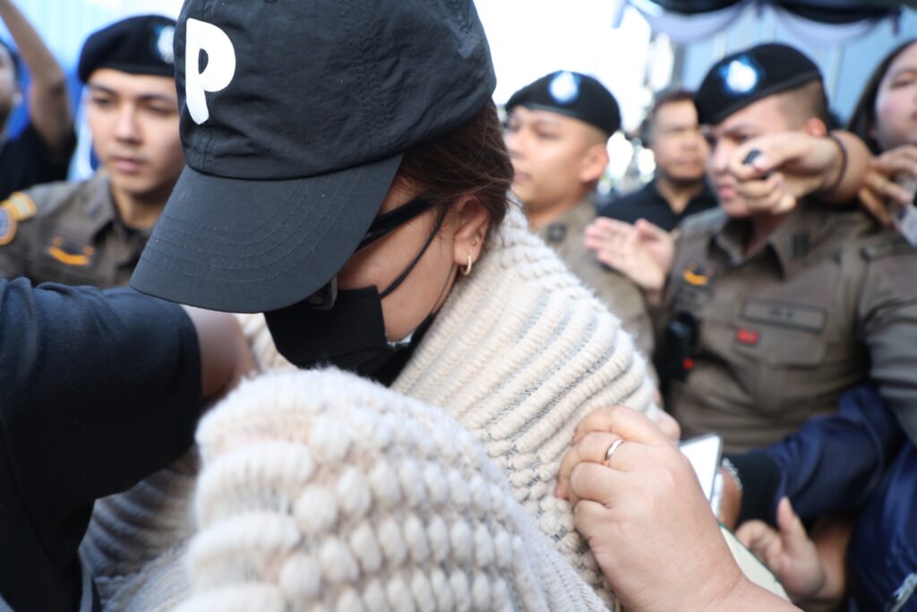 โดยเธอยังคงสวมชุดเดิมตั้งแต่ถูกจับกุม ทั้งผ้าคลุม หมวก แว่นกันแดด และหน้ากากอนามัยปิดบังใบหน้าอย่างแนบแน่น ขณะที่ตำรวจเกือบ 10 นาย กระจายกำลังคอยคุ้มกันอย่างเข้มงวด เพื่อกันกระแสสื่อและประชาชนที่พยายามเข้าใกล้