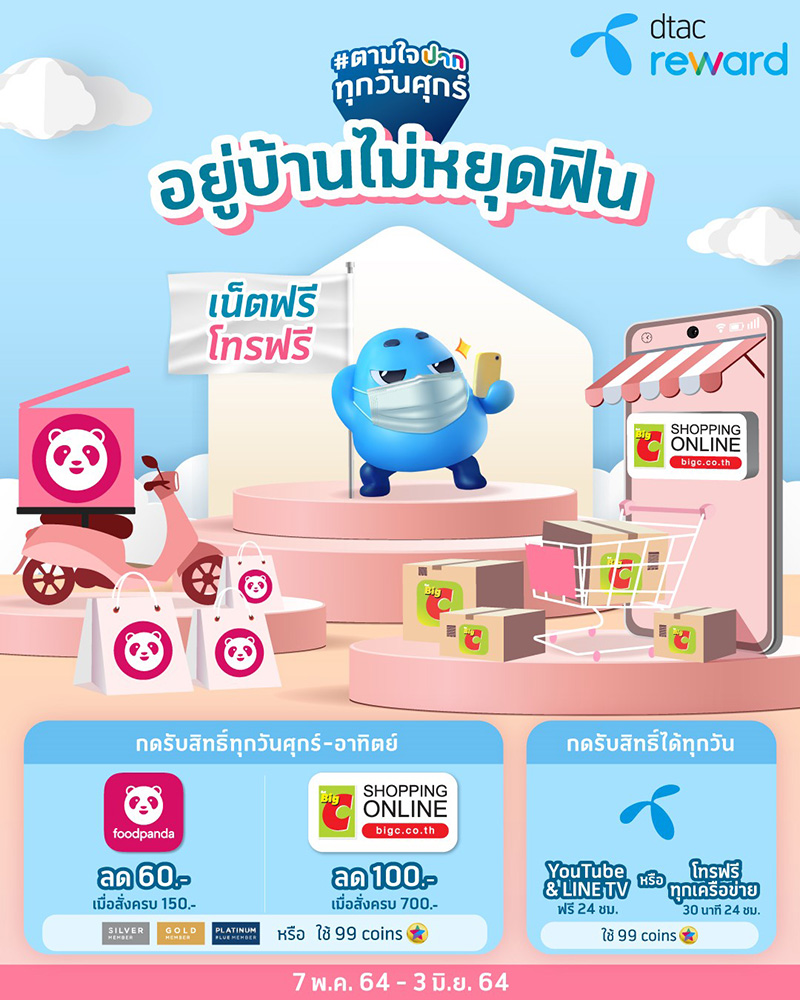 ในช่วงเดือนพฤษภาคม ถึง มิถุนายน ที่มีการ work From Home me ดีแทค รีวอร์ดได้จัดสิทธิพิเศษ ดูแลลูกค้าที่ทำงานอยู่ที่บ้านให้ปลอดภัยห่างไกลโควิด-19 ภายใต้แคมเปญตามใจปากทุกวันศุกร์ ผ่านช่องทางดีแทค แอป สำหรับลูกค้า Silver Member/Gold Member/Platinum Blue Member หรือใช้เพียง 99 Coins รับส่วนลด 60 บาท เมื่อสั่งอาหารผ่าน foodpanda ครบ 150 บาท และรับส่วนลด 100 บาท เมื่อช้อปปิ้งออนไลน์จาก Big C Shopping Online ครบ 700 บาท เริ่มตั้งแต่วันที่ 7 พ.ค. – 3 มิ.ย. 2564 กดรับสิทธิ์ทุกวันศุกร์ถึงวันอาทิตย์