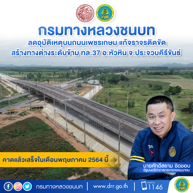 กรมทางหลวงชนบท สร้างทางต่างระดับข้าม ทล.37 อ.หัวหิน จ.ประจวบคีรีขันธ์ ลดอุบัติเหตุบนถนนเพชรเกษม แก้จราจรติดขัด คาดแล้วเสร็จในเดือนพฤษภาคม 2564 นี้