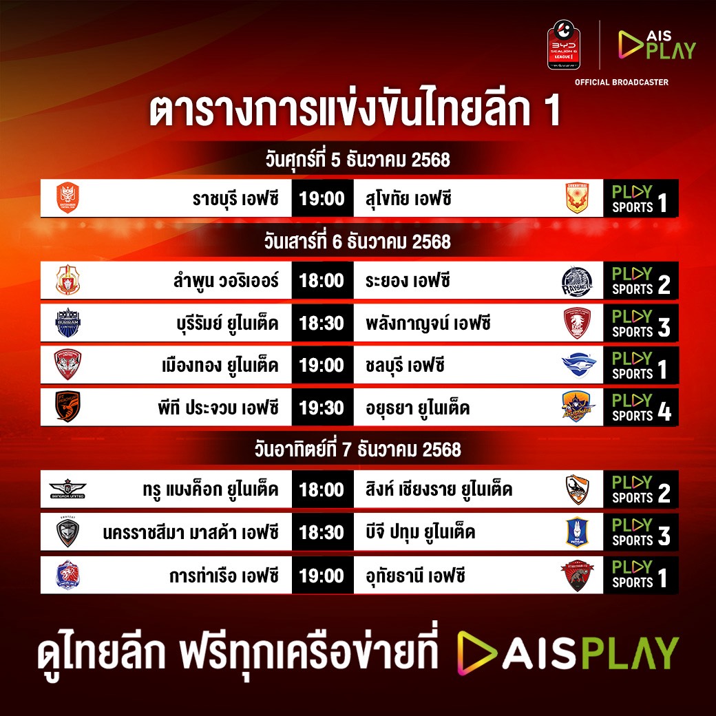 ฟุตบอลไทยลีก 1 “บีวายดี ซีไลออน 6 ลีกหนึ่ง” ลงสนามแข่งขันกันอย่างต่อเนื่อง โดย AIS PLAY ยังคงเอาใจคอบอลไทย ยิงสดจากขอบสนามให้ทุกคนได้ชมกันแบบฟรีๆ เหมือนเดิม