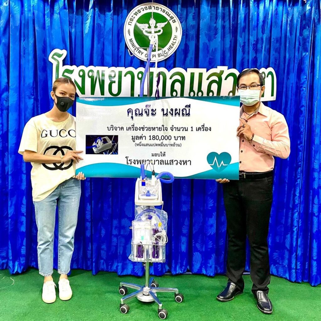 โดยสาวจ๊ะ ได้โพสต์ภาพพร้อมข้อความลงในอินสตาแกรมส่วนตัวว่า “วันเกิดปีนี้ มอบเครื่องช่วยหายใจ ให้ รพ.แสวงหา จ.อ่างทอง ขอให้บุญกุศลที่จ๊ะทำในครั้งนี้ส่งผลให้ทุกคนปลอดภัย 🙏🏻”