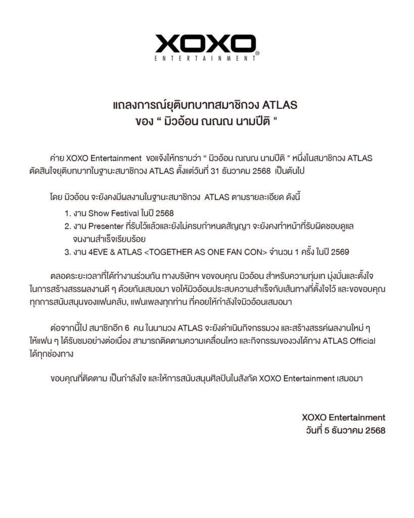 ต่อมาทางต้นสังกัดได้ออกมาแถลงการณ์ยุติบทบาทสมาชิกวง ATLAS ของ “มิวอ้อน” ซึ่งเขียนข้อความว่า “แถลงการณ์ยุติบทบาทสมาชิกวง ATLAS ของ “มิวอ้อน ณณณ นามปีติ ” ค่าย XOXO Entertainment ขอแจ้งให้ทราบว่า ” มิวอ้อน ณณณ นามปีติ ” หนึ่งในสมาชิกวง ATLAS ตัดสินใจยุติบทบาทในฐานะสมาชิกวง ATLAS ตั้งแต่วันที่ 31 ธันวาคม 2568 เป็นต้นไป
