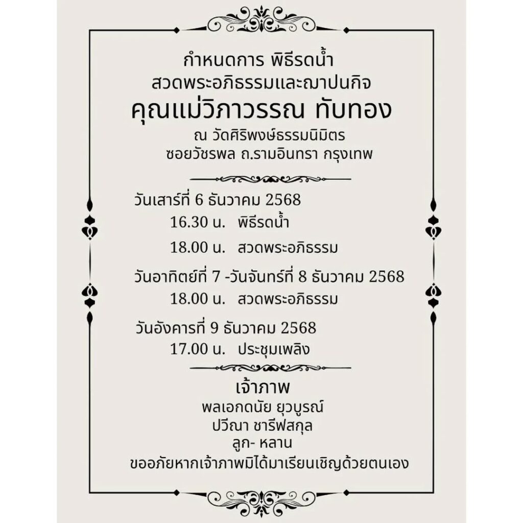 โดยพิธีรดน้ำศพถูกจัดขึ้นเมื่อวานที่ผ่านมา เริ่มสวดพระอภิธรรมจนถึงวันจันทร์ที่ 8 ธันวาคม และมีพิธีฌาปนกิจในวันอังคารที่ 9 ธันวาคม ซึ่งในโพสต์ดังกล่าวได้มีแฟนคลับและเพื่อนร่วมวงการบันเทิงเข้ามาแสดงความไว้อาลัยและแสดงความเสียใจอย่างมากมาย