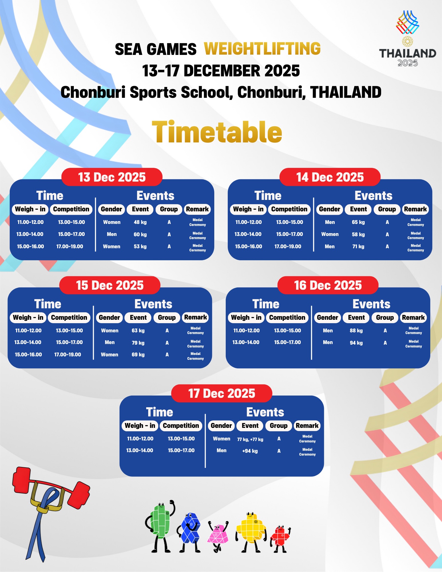ทั้งนี้ทีมไทยส่งนักกีฬาชิงชัยครบทุกรุ่น โดยวันแรกของการชิงเหรียญทองยกน้ำหนัก 3 รุ่น 3 เหรียญทอง นางสาวธรรญธร สุขข์เจริญ จะขึ้นเวทีเป็นคนแรกของทีมในวันที่ 13 ธันวาคม 2568 เวลา 13.00 น. รุ่น 48 กิโลกรัมหญิง จากนั้นเวลา 15.00 น. รุ่น 60 กิโลกรัมชาย จ่าตรีธีรพงศ์ ศิลาชัย เจ้าของเหรียญเงินโอลิมปิก 2024 และ เวลา 17.00 น. รุ่น 53 กิโลกรัมหญิง สิบตรีหญิง สุรจนา คำเบ้า เจ้าของเหรียญทองแดงโอลิมปิก 2024