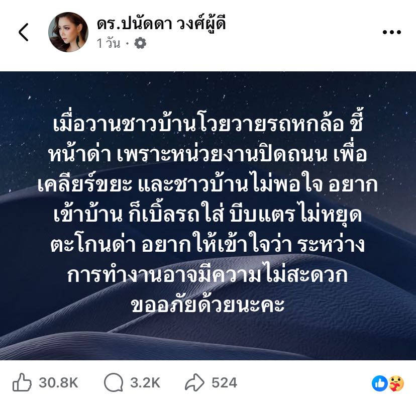 ล่าสุดก็มีเรื่องให้ “บุ๋ม ปนัดดา” ต้องปวดหัวเมื่อเธอออกมาโพสต์ข้อความผ่านเฟสบุ๊กส่วนตัวว่า “เมื่อวานทีมงานมูลนิธิของเธอเข้าไปจัดการกองขยะมหาศาลใน ซอยเลียบคลองระเบียงน้ำ ร.1หลังสถานการณ์น้ำท่วมคลี่คลาย แต่กลับเจอเหตุการณ์ไม่คาดคิดเนื่องจากถูกชาวบ้านโวยวาย เบิ้ลรถใส่ ตะโกนด่า เพราะหน่วยงานปิดถนนเพื่อเคลียร์ขยะ ทำให้ชาวบ้านไม่สามารถนำรถเข้าบ้านได้” ท่ามกลางชาวเน้ตเข้ามาส่งกำลังใจให้เป็นจำนวนมาก