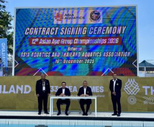 ฟาริด แฟททาเฮียน ผู้อำนวยการสหพันธ์กีฬาทางน้ำเอเชีย และ พล.อ.สุพล จันทร์ผ่อง อุปนายกสมาคมกีฬาทางน้ำแห่งประเทศไทย ร่วมกันเซ็นสัญญาให้ไทยเป็นเจ้าภาพการแข่งขันว่ายน้ำเอเชียนเอจกรุ๊ป 2026 โดยมี พล.ต.ดร.ธนนท์ แสงนาค อุปนายกสมาคม และ “โค้ชตึก” นายธนาวิชญ์ โถสกุล เลขาธิการสมาคมกีฬาทางน้ำแห่งประเทศไทย เป็นสักขีพยาน ที่สระว่ายน้ำ กกท.