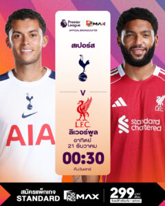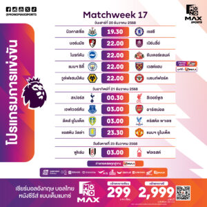 ต่อเนื่องกันยาว ๆ ใน เวลา 00.30 น. วันอาทิตย์ที่ 21 ธันวาคม 2568 (คืนวันเสาร์ที่ 20 ธันวาคม 2568) Monomax ยิงสดบิ๊กแมตช์ระหว่าง ท็อตแนม ฮ็อตสเปอร์ส พบ ลิเวอร์พูล ศึกของสองทีมระดับท็อปที่กำลังขับเคี่ยวในกลุ่มหัวตาราง ต่อด้วยเกมช่วง เวลา 03.00 น. เอฟเวอร์ตัน เปิดบ้านรับ อาร์เซนอล ทีมลุ้นแชมป์ที่ต้องรักษามาตรฐานการเก็บแต้มอย่างสม่ำเสมอ และอีกสนาม ลีดส์ ยูไนเต็ด พบ คริสตัล พาเลซ เกมสำคัญของทีมกลางตารางที่ยังต้องระวังการไหลลงสู่กลุ่มเสี่ยง ก่อนจะปิดท้ายวันอาทิตย์ด้วยเกมใหญ่ เวลา 23.30 น. แอสตัน วิลลา ทีมฟอร์มแรงในบ้าน เปิดศึกกับ แมนเชสเตอร์ ยูไนเต็ด ซึ่งเกมนี้มีผลต่ออันดับโดยตรงของทั้งสองทีม และอาจเป็นจุดเปลี่ยนของช่วงครึ่งฤดูกาลหลัง