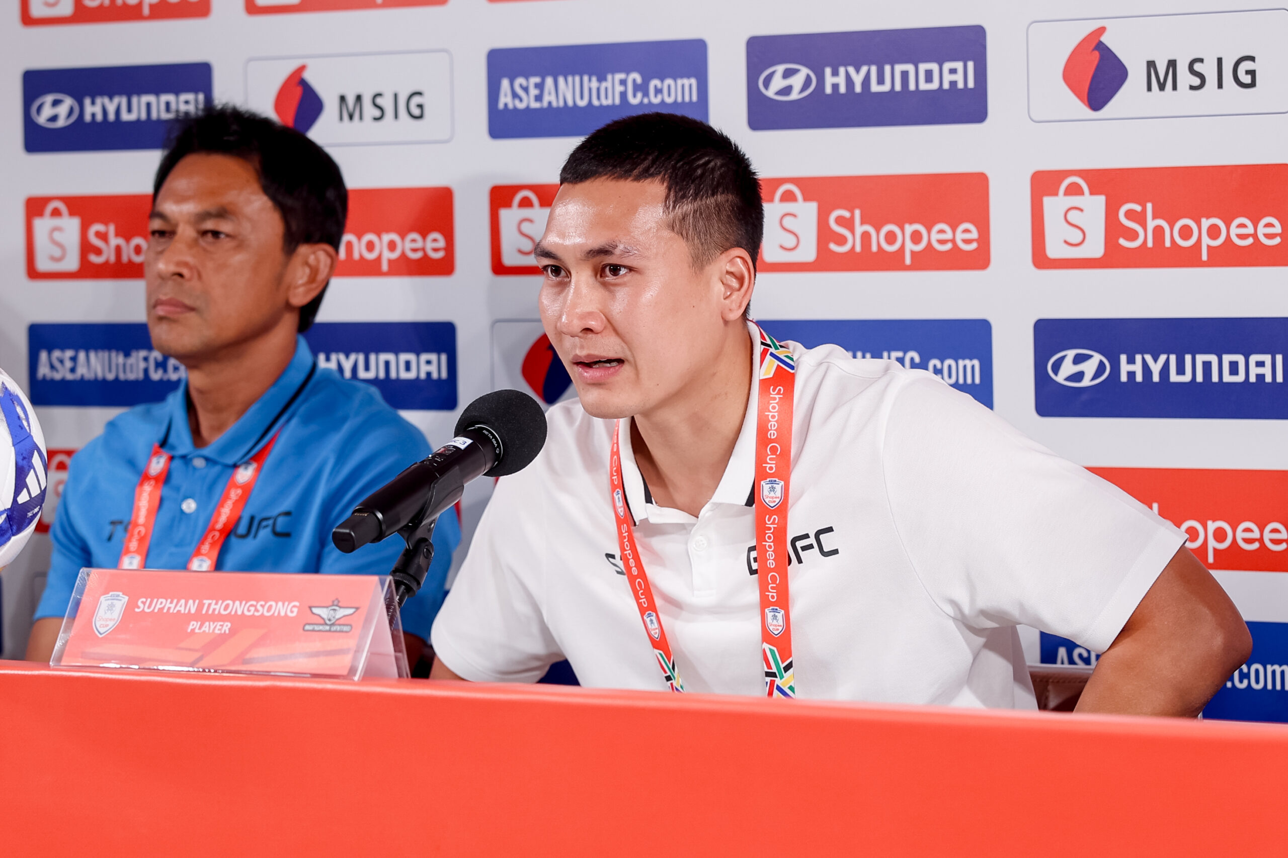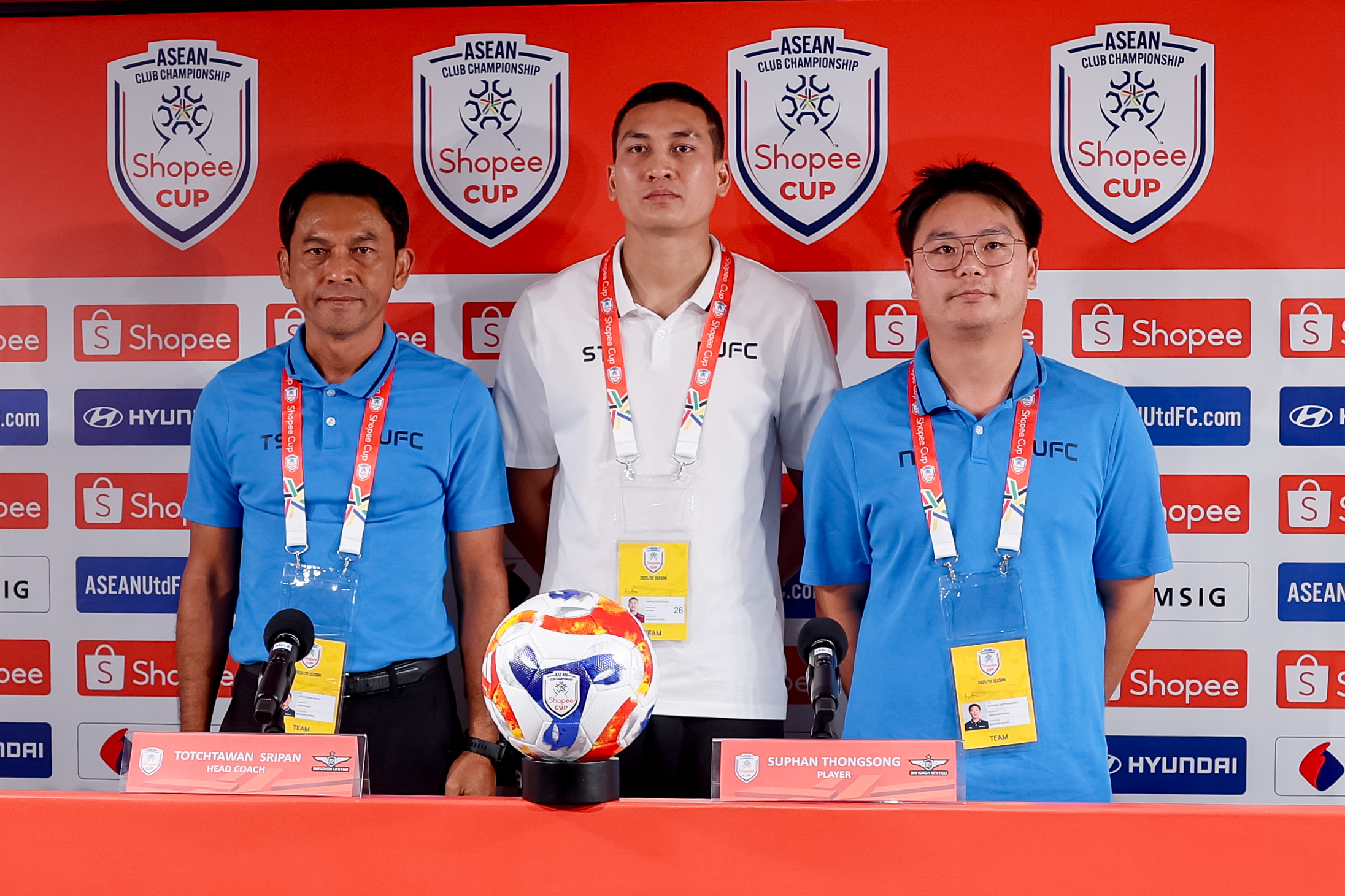 ณ ห้องแถลงข่าวสนามทรูบีจี สเตเดี้ยม “โค้ชแบน” ธชตวัน ศรีปาน และ สุพรรณ ทองสงค์ ในฐานะตัวแทนของสโมสรทรู แบงค็อก ยูไนเต็ด เข้าร่วมแถลงข่าวก่อนเกมการแข่งขัน ฟุตบอลชิงแชมป์สโมสรอาเซียน “Shopee Cup” 2025/26 รอบแบ่งกลุ่ม นัดที่สาม (นัดตกค้าง) ที่จะเปิดบ้านพบ นัม ดินห์ เอฟซี ตัวแทนจากเวียดนาม ในวันพรุ่งนี้