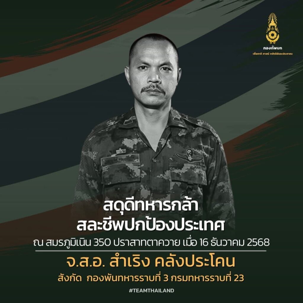 18. จ.ส.อ.สำเริง คลังประโคน สังกัด กองพันทหารราบที่ 3 กรมทหารราบที่ 23 เสียชีวิตในสมรภูมิเนิน 350 ปราสาทตาควาย เมื่อวันที่ 16 ธันวาคม 2568