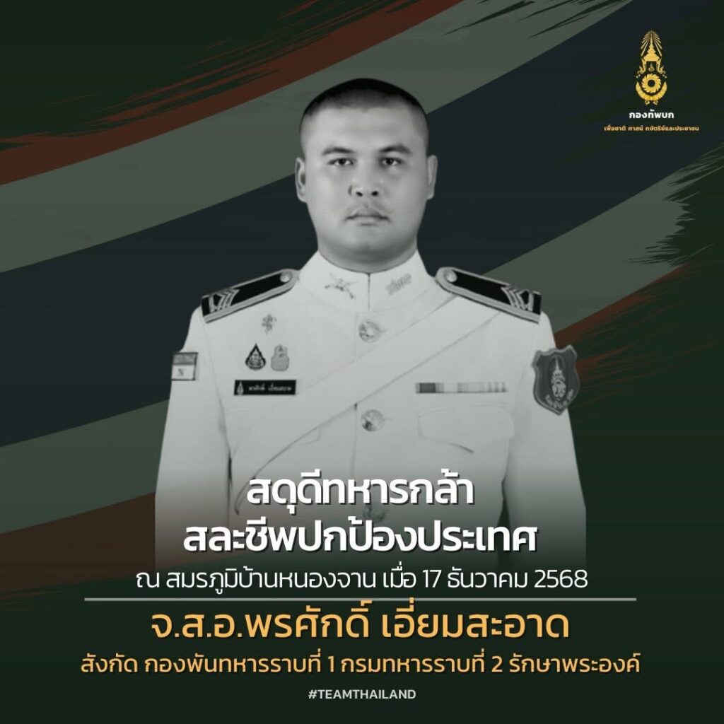 20. จ.ส.อ.พรศักดิ์ เอี่ยมสะอาด” สังกัด กองพันทหารราบที่ 1 กรมทหารราบที่ 2 รักษาพระองค์ เสียชีวิตในสมรภูมิ บ้านหนองจาน เมื่อวันที่ 17 ธันวาคม 2568
