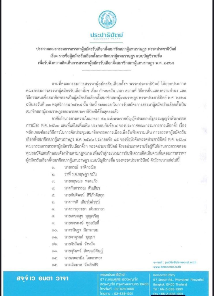ส่อง 100 บัญชีรายชื่อปาร์ตี้ลิสต์ พรรคประชาธิปัตย์ เรียงตามอักษร ”ชวน-อภิสิทธิ์” นำทีม – ”บัญญัติ” ขอวางมือ – ”ชัยชนะ” เปิดทาง ”กนกพร” ชิง สส.เมืองคอนแทน – หน้าเก่าแห่กลับซบ ปชป.เพียบ