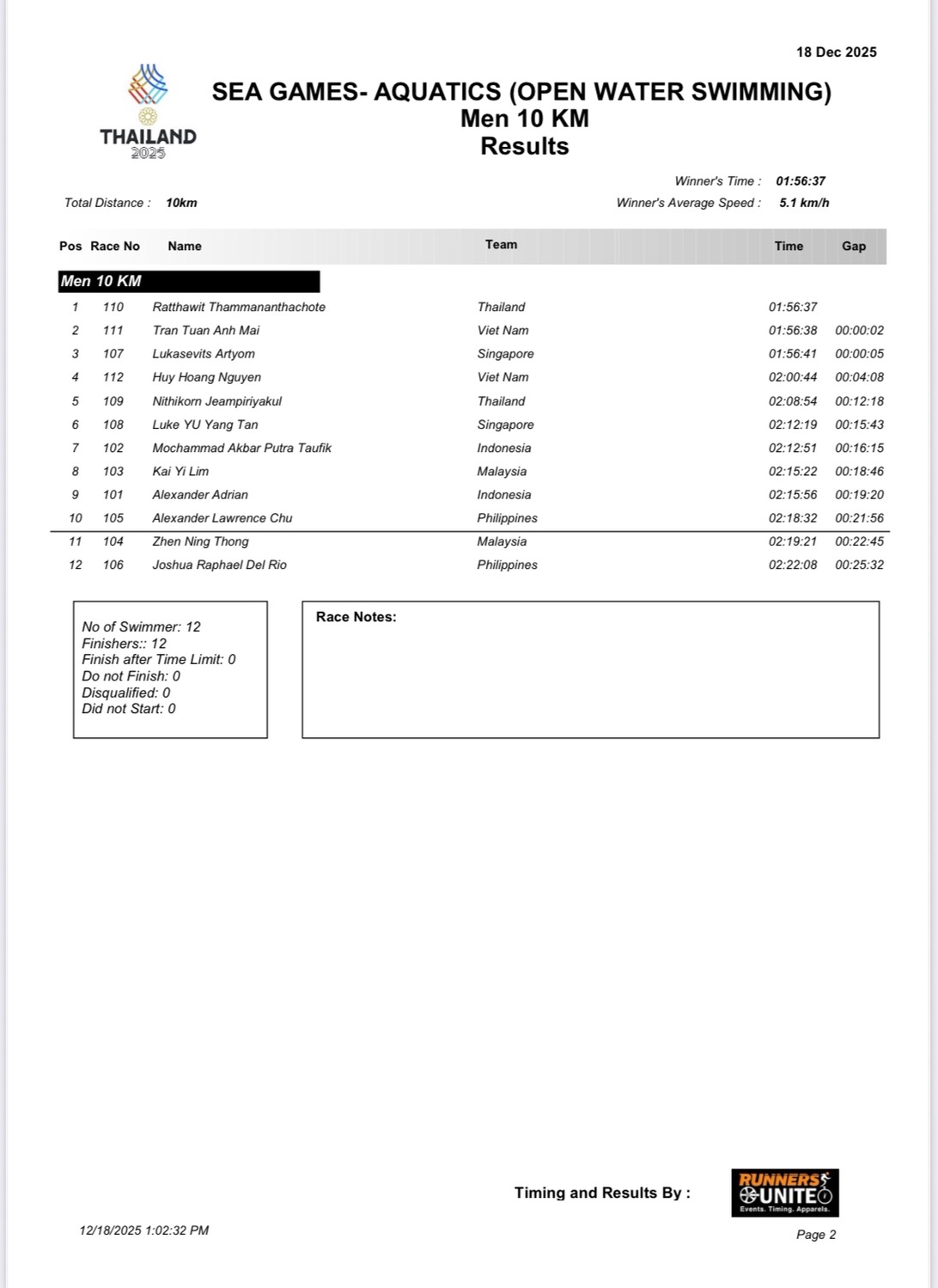 โดยการแข่งขันต้องลุ้นระทึกกันจนวินาทีสุดท้ายของประเภทชายเมื่อ 3 นักว่ายน้ำจาก 3 ชาติเข้ามาพร้อมกัน ดูจากสายตามแทบจะแยกไม่ออกว่าใครเข้ามาเป็นอันดับ 1 แต่เมื่อสถิติปรากฏกองเชียร์ไทยได้เฮ เมื่อเป็นชื่อของ “ฉลามเป้” รัฐวิทย์ ธรรมนันทโชติ อันดับ 1 เวลา 1 ชั่วโมง 56 นาที 37 วินาที คว้าเหรียญทองไปครอง ส่วนเหรียญเงินเป็นของ ไม ทราน ทวน จากเวียดนาม ทำเวลาได้  1 ชั่วโมง 56 นาที 38 วินาที และเหรียญทองแดงเป็นของ ลูก้าเซวิท อาร์ตยอม จากสิงคโปร์ ทำเวลาได้ 1 ชั่วโมง 56 นาที 41 วินาที