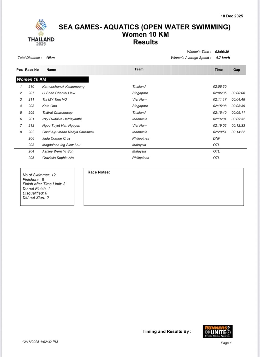 ว่ายน้ำมาราธอนซีเกมส์ ที่หาดจอมเทียน พัทยา ชิงชัย 2 เหรียญทอง ระยะ 10 กิโลเมตร ชาย และ หญิง โดยไทยส่ง 4 เงือก-ฉลามจอมอึดอย่าง กมนชนก ขวัญเมือง, ฐิติรัตน์ เจริญทรัพย์, นิธิกร เจียมพิริยะกุล และ รัฐวิทย์ ธรรมนันทโชติ