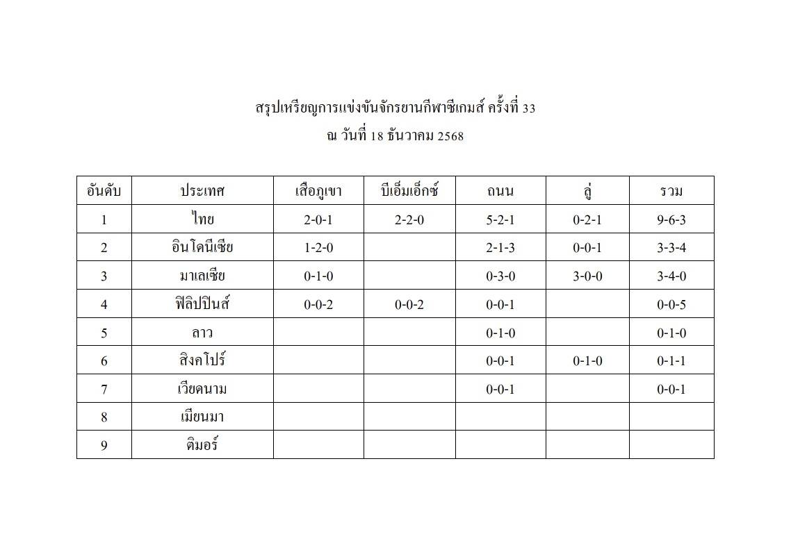สรุปเหรียญรางวัลกีฬาจักรยานกีฬาซีเกมส์ เสือภูเขา, บีเอ็มเอ็กซ์, ถนน และลู่ ได้มาทั้งหมด 9 เหรียญทอง 6 เหรียญเงิน 3 เหรียญทองแดง และยังเหลือการแข่งขันจักรยานประเภทลู่ วันสุดท้าย อีก 2 เหรียญทอง