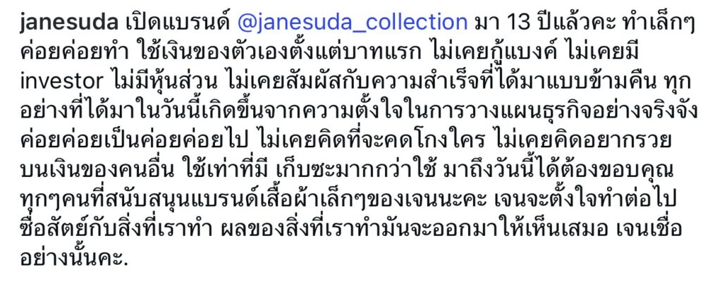 ล่าสุดทำเอาหลายคนขนลุกไม่เบา เมื่อทางด้าน “เจนสุดา” ได้ออกมาร่ายยาวการทำแบรนด์เสื้อผ้าด้วยเงินทุกบาททุกสตางค์ของตัวเองไม่เคยคิดที่จะคดโกงใคร ไม่เคยคิดอยากรวยบนเงินของคนอื่น โดยโพสต์ภาพพร้อมแคปชั่นว่า “เปิดแบรนด์ @janesuda_collection มา 13 ปีแล้วคะ ทำเล็กๆค่อยค่อยทำ ใช้เงินของตัวเองตั้งแต่บาทแรก ไม่เคยกู้แบงค์ ไม่เคยมี investor ไม่มีหุ้นส่วน ไม่เคยสัมผัสกับความสำเร็จที่ได้มาแบบข้ามคืน ทุกอย่างที่ได้มาในวันนี้เกิดขึ้นจากความตั้งใจในการวางแผนธุรกิจอย่างจริงจัง ค่อยค่อยเป็นค่อยค่อยไป”