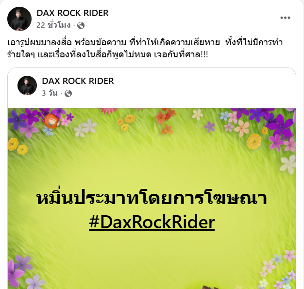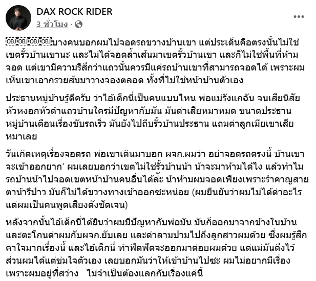 ต้นสังกัด “แด๊กซ์ ROCK RIDER” แจงปมคลิปเหตุจอดรถขวางบ้าน-ลามปามลูกสาว วอนหยุดบิดเบือนข้อเท็จจริง หากพบจะดำเนินการตามกฎหมาย