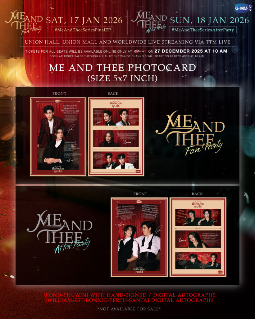 สำหรับผู้ที่สนใจสามารถจองบัตรทั้ง 2 รอบการแสดงของงาน “Me and Thee Fan Party”และ “Me and Thee After Party” เปิดจำหน่ายบัตรบนช่องทาง Online วันเสาร์ที่ 27 ธันวาคม 2568 เริ่มเวลา 10:00 น. เป็นต้นไป เปิดจำหน่ายทุกที่นั่ง ทางออนไลน์ www.thaiticketmajor.com เท่านั้น และเปิดจำหน่ายบัตรทุกช่องทางตามปกติ ในวันอาทิตย์ที่ 28 ธันวาคม 2568 เริ่มเวลา 10:00 น. เป็นต้นไป บัตรราคา 4,500 / 4,000 / 3,500 / 3,000 / 2,500 / 2,000 / 1,500 บาท ที่ ไทยทิคเก็ตเมเจอร์ทุกสาขา, www.thaiticketmajor.com และ Call Center โทร 0-2262-3456 และดูสดผ่าน TTM LIVE บัตรราคา 1,200 / 990 บาท (ลิ้งค์และโค้ดรับชม) (กรณีต้องการรับบัตรพลาสติกที่ระลึกชำระเพิ่ม 30 บาท /ใบ) หรือติดตามรายละเอียดเพิ่มเติมได้ที่ www.thaiticketmajor.com หรือ www.facebook.com/gmmtvofficial & Instagram & X & TikTok & YouTube & Weibo : GMMTV