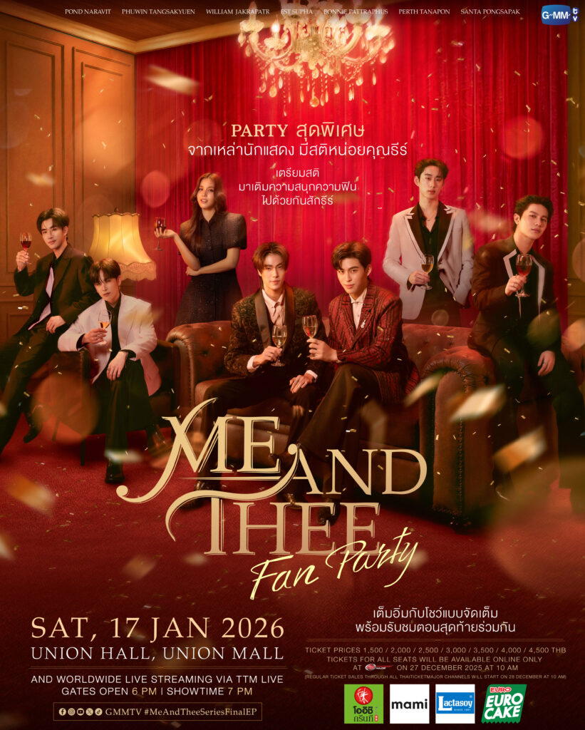 นาทีนี้ถ้าพูดถึงซีรีส์ที่ทำเอาแฟนๆ อินกันทั่วบ้านทั่วเมืองไปถึงทั่วโลก จนแฮชแท็กพุ่งทะยานติดเทรนด์ X “อันดับ 1” ของโลกทุกสัปดาห์ คงหนีไม่พ้นซีรีส์พล็อตเรื่องโดนใจและไดอะล็อกสุดฮิตมากมายที่ทำให้คนดูทั้งลุ้นทั้งขำ จนอยากจะตะโกนใส่หน้าจอตามชื่อเรื่อง “มีสติหน่อยคุณธีร์ Me and Thee” จาก “GMMTV” คอนเทนต์โพรไวเดอร์ชั้นนำของเมืองไทย กลายเป็นซีรีส์ฟีเวอร์ฮอตสุดๆ ในตอนนี้ และเพื่อให้คอซีรีส์ได้สนุกสนานเต็มอิ่มแบบใกล้ชิด กับเหล่านักแสดงที่นำโดยสองหนุ่มสุดฮอต “ปอนด์ ณราวิชญ์ เลิศรัตน์โกสุมภ์” กับ “ภูวินทร์ ตั้งศักดิ์ยืน” พร้อมด้วย “วิลเลี่ยม จักรภัทร แก้วพันธุ์พงษ์, เอส ศุภ สง่าวรวงศ์, บอนนี่ ภัทราภัสร์ โบรัชตะสุวรรณ์, เพิร์ธ ธนพนธ์ สุขุมพันธนาสาร และ แซนต้า พงศภัค อุดมโภชน์” ที่รวมตัวกันจัดปาร์ตี้สุดเอ็กซ์คลูซีฟ เตรียมสาดความสนุกและความฟินแบบจัดเต็มให้แฟนๆ แบบจุใจ 2 วันเต็ม ในงาน “Me and Thee Fan Party” และ “Me and Thee After Party”