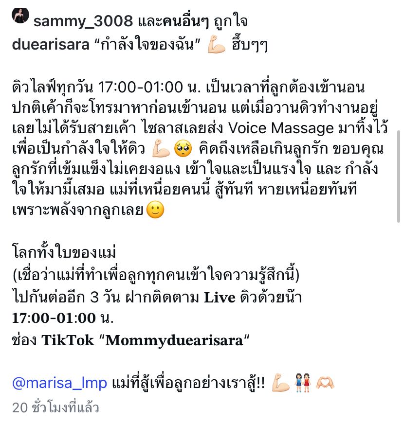 ทางด้าน ดิว ก็ได้เขียนแคปชั่นของคลิปว่า ดิวไลฟ์ทุกวัน 17:00-01:00 น. เป็นเวลาที่ลูกต้องเข้านอน ปกติเค้าก็จะโทรมาหาก่อนเข้านอน แต่เมื่อวานดิวทำงานอยู่เลยไม่ได้รับสายเค้า ไซลาสเลยส่ง Voice Massage มาทิ้งไว้เพื่อเป็นกำลังใจให้ดิว คิดถึงเหลือเกินลูกรัก ขอบคุณลูกรักที่เข้มแข็งไม่เคยงอแง เข้าใจและเป็นแรงใจ และ กำลังใจให้มามี๊เสมอ แม่ที่เหนื่อยคนนี้ สู้ทันที หายเหนื่อยทันที เพราะพลังจากลูกเลย โลกทั้งใบของแม่(เชื่อว่าแม่ที่ทำเพื่อลูกทุกคนเข้าใจความรู้สึกนี้) ไปกันต่ออีก 3 วัน ฝากติดตาม 𝐋𝐢𝐯𝐞 ดิวด้วยน๊า 𝟏𝟕:𝟎𝟎-𝟎𝟏:𝟎𝟎 น. ช่อง 𝐓𝐢𝐤𝐓𝐨𝐤 “𝐌𝐨𝐦𝐦𝐲𝐝𝐮𝐞𝐚𝐫𝐢𝐬𝐚𝐫𝐚“