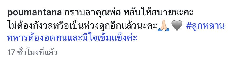 โดย “ปู” ได้โพสต์ภาพบรรยากาศงานรดน้ำศพและข้อความอำลาสุดบีบหัวใจให้คุณพ่อเป็นครั้งสุดท้ายว่า กราบลาคุณพ่อ หลับให้สบายนะคะ ไม่ต้องกังวลหรือเป็นห่วงลูกอีกแล้วนะคะ #ลูกหลานทหารต้องอดทนและมีใจเข้มแข็งค่ะ