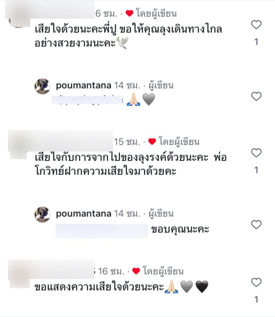 หลังจากที่“ปู” โพสต์ภาพพร้อมข้อความไว้อาลัยดังกล่าว แฟนคลับต่างเข้ามาคอมเมนต์แสดงความเสียใจ พร้อมส่งกำลังใจและความห่วงใยให้ปูกับครอบครัวเป็นจำนวนมาก