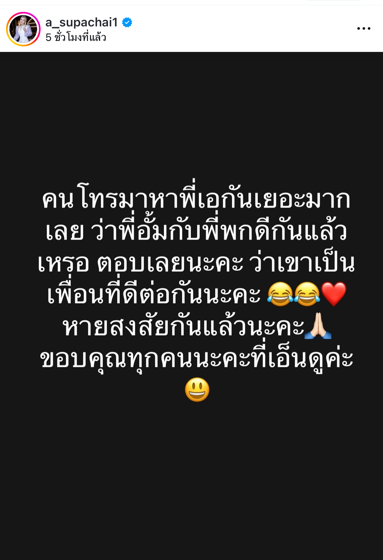 แต่ยินดีไม่ทันไรทางด้าน ”เอ ศุภชัย” รีบออกมาเบรกแรง โดยโพสต์ข้อความว่า “คนโทร.มาหาพี่เอกันเยอะมากเลย ว่าพี่อั้มกับพี่พกดีกันแล้วเหรอตอบเลยนะคะว่าเขาเป็นเพื่อนที่ดีต่อกันนะคะ หายสงสัยกันแล้วนะคะ ขอบคุณทุกคนนะคะที่เอ็นดูค่ะ”