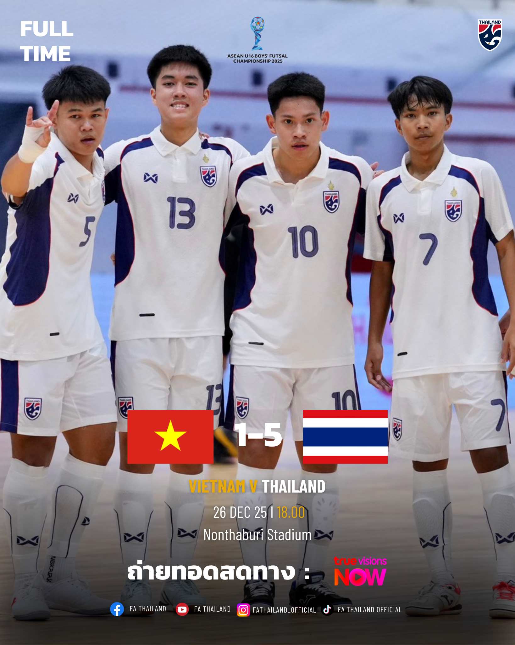 โปรแกรมนัดต่อไป ฟุตซอลชายทีมชาติไทยรุ่นอายุไม่เกิน 16 ปี จะทำการแข่งขันฟุตซอลชายชิงแชมป์อาเซียนรุ่นอายุไม่เกิน 16 ปี นัดที่สี่ พบกับ อินโดนีเซีย ที่ นนทบุรี สเตเดียม ในวันที่ 27 ธันวาคม 2568 เวลา 13.30 น. ถ่ายทอดสดทาง แอพพลิเคชั่น TrueVision Now