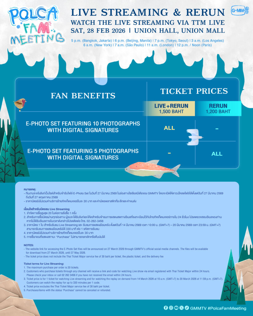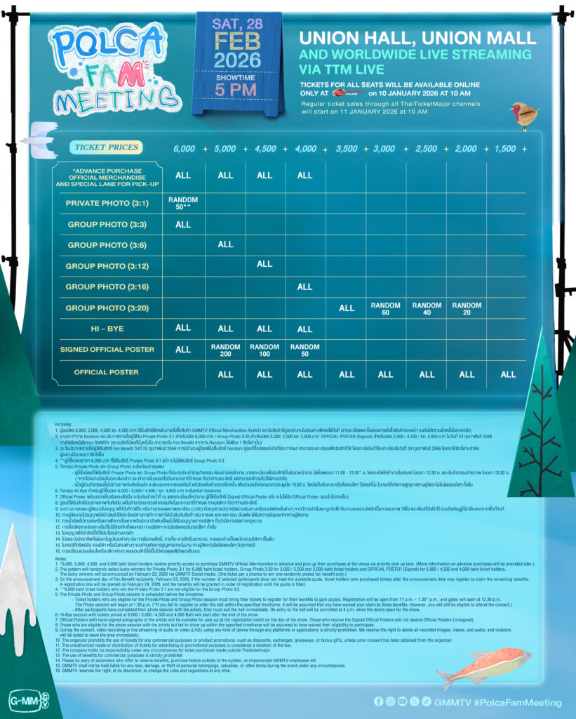 สำหรับผู้สนใจสามารถจับจองบัตรงาน “POLCA FAM MEETING” บนช่องทางออนไลน์ ในวันเสาร์ที่ 10 มกราคม 2569 เริ่มเวลา 10.00 น. เป็นต้นไป เปิดจำหน่ายทุกที่นั่ง ทางออนไลน์ที่ www.thaiticketmajor.com เท่านั้น และ เปิดจำหน่ายบัตร ทุกช่องทางตามปกติ ในวันอาทิตย์ที่ 11 มกราคม 2569 เริ่มเวลา 10.00 น. เป็นต้นไป ทางไทยทิคเก็ตเมเจอร์ทุกสาขา, www.thaiticketmajor.com และ Call center โทร 0-2262-3456 โดยบัตรราคา 6,000 / 5,000 / 4,500 / 4,000 / 3,500 / 3,000 / 2,500 / 2,000 / 1,500 บาท และดูสดผ่าน TTM LIVE บัตรราคา 1,500 / 1,200 บาท (ลิ้งค์และโค้ดรับชม) (กรณีต้องการรับบัตรพลาสติกที่ระลึก ชำระเพิ่ม 30/ใบ) หรือติดตามรายละเอียดเพิ่มเติมได้ที่ www.thaiticketmajor.com หรือ www.facebook.com/gmmtvofficial & Instagram & X & TikTok & YouTube & Weibo : GMMTV