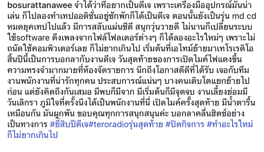 “เปิดไมค์ครั้งสุดท้าย มีน้ำตารื้นเหมือนกัน มันผูกพัน ขอบคุณทุกการสนุกสนุนค่ะ บอกลาคลื่นฮิตซ์อย่างเป็นทางการ #ยี่สิบปีดีเจ#teroradioรุ่นสุดท้าย #ปิดกิจการ #ทำอะไรใหม่ก็ไม่ยากเกินไป”