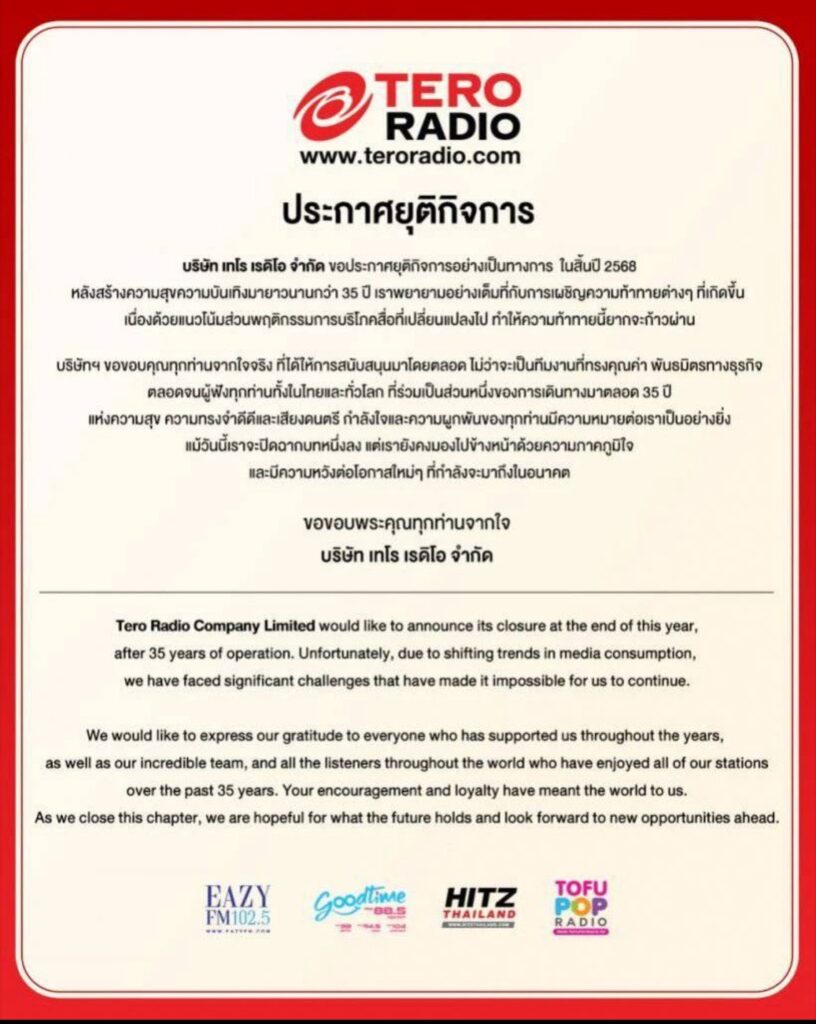 เรียกว่าเป็นเรื่องช็อควงการสื่อไม่น้อย เมื่อทางด้าน บริษัท เทโร เรดิโอ จำกัด ได้ออกมาประกาศยุติ กิจการอยากเป็นทางการ หลังดำเนิน ธุรกิจผลิตรายการวิทยุมานานถึง35ปี ท่ามกลางแฟนคลับผู้ฟังต่างออกมาแสดงความเสียใจกันเต็มโลกออนไลน์