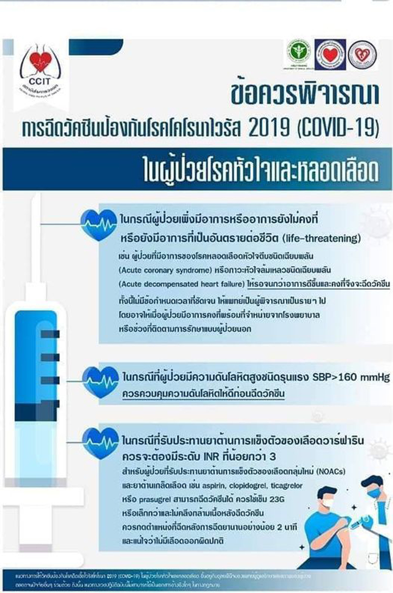 อ.น.พ.รังสฤษฎ์ กาญจนะวณิชย์ อาจารย์ภาควิชาอายุรศาสตร์ คณะแพทยศาสตร์ มหาวิทยาลัยเชียงใหม่ ได้โพสต์เฟซบุ๊ก Rungsrit Kanjanavanit เกี่ยวกับกรณีผู้ป่วยโรคหัวใจสามารถฉีดวัคซีนโควิด-19 ได้ไหม ควรฉีดไหม ว่า ตนเองยืนยันการมีโรคประจำตัว อย่างโรคหัวใจ เบาหวาน โรคอ้วน หรือ อายุมากหากติดโควิด ล้วนมีความเสี่ยงที่จะเกิดอาการรุนแรงมากกว่าคนทั่วไป และยังไม่มีหลักฐานทางวิทยาศาสตร์ที่แน่ชัดว่า ผู้ป่วยกลุ่มนี้จะมีความเสี่ยงกับผลข้างเคียงวัคซีนมากกว่าปกติ หรือ วัคซีนตัวใดจะปลอดภัยกว่ากันในผู้ป่วยที่มีโรคหัวใจ