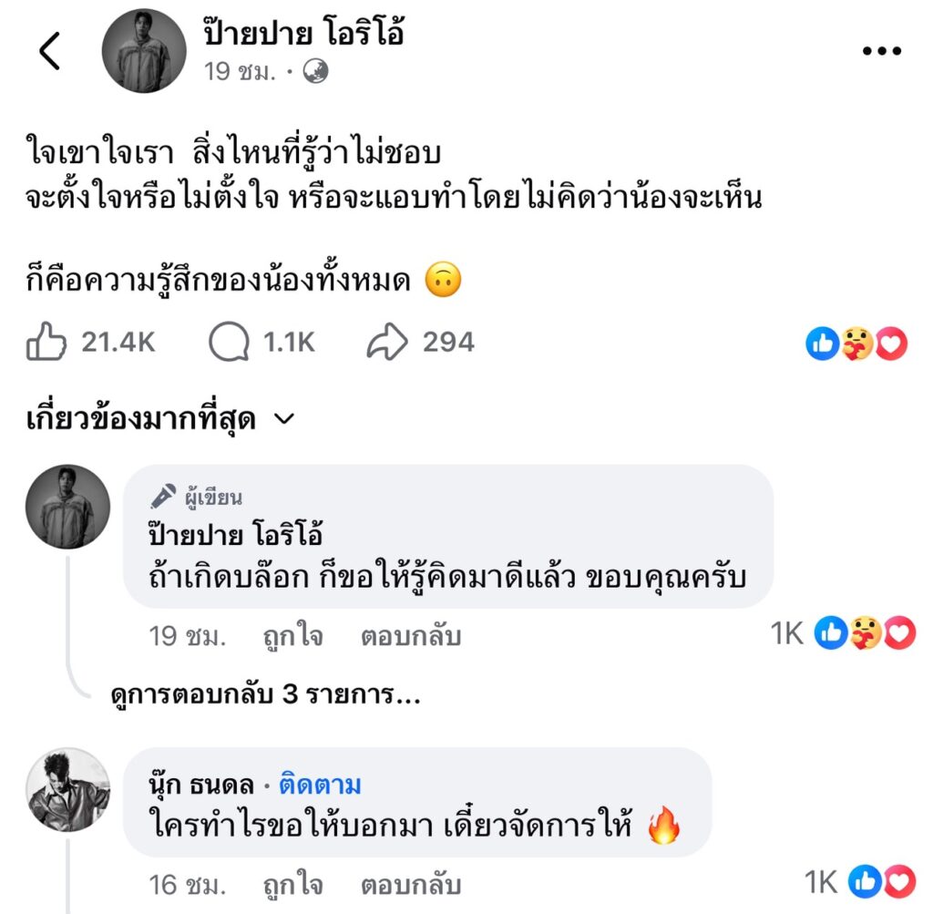 และยังได้เขียนใต้คอมเมนต์เพิ่มเติมว่า “ถ้าเกิดบล๊อก ก็ขอให้รู้คิดมาดีแล้ว ขอบคุณครับ , ใครทำไรขอให้บอกมา เดี๋ยวจัดการให้ 🔥“ ท่ามกลางความสงสัยว่าเกิดอะไรขึ้นกันแน่ ยังไงก็ต้องรอให้ ”ป๊ายปาย“ ออกมาพูดเองนะคะ อย่าเพิ่งตีความกันไปเอง