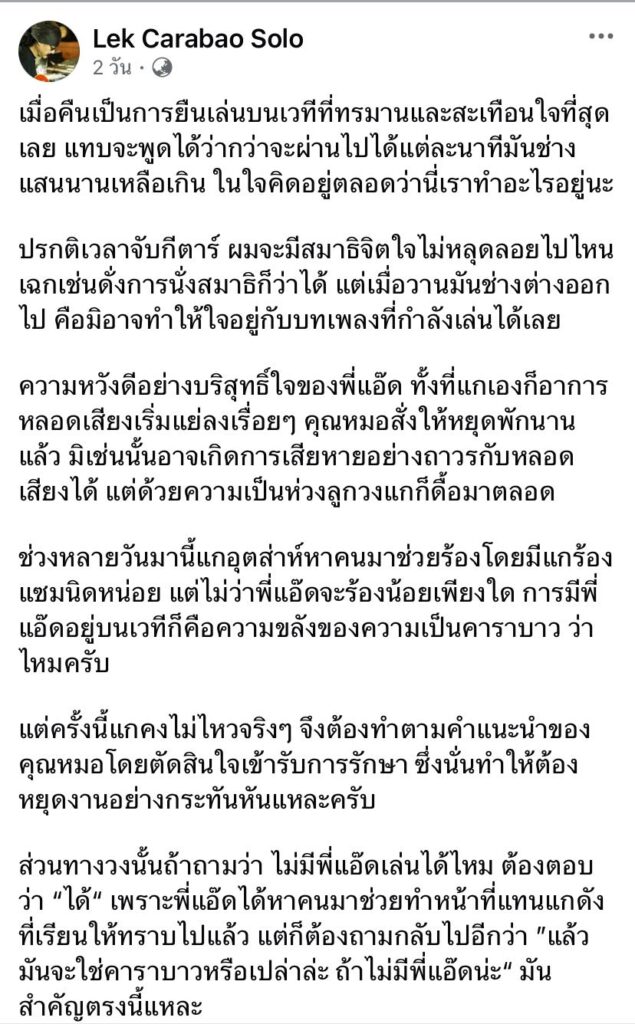ล่าสุด “เล็ก คาราบาว” มือกีตาร์คู่ใจและหนึ่งในสมาชิกวงคาราบาว ได้ออกมาโพสต์ข้อความว่า