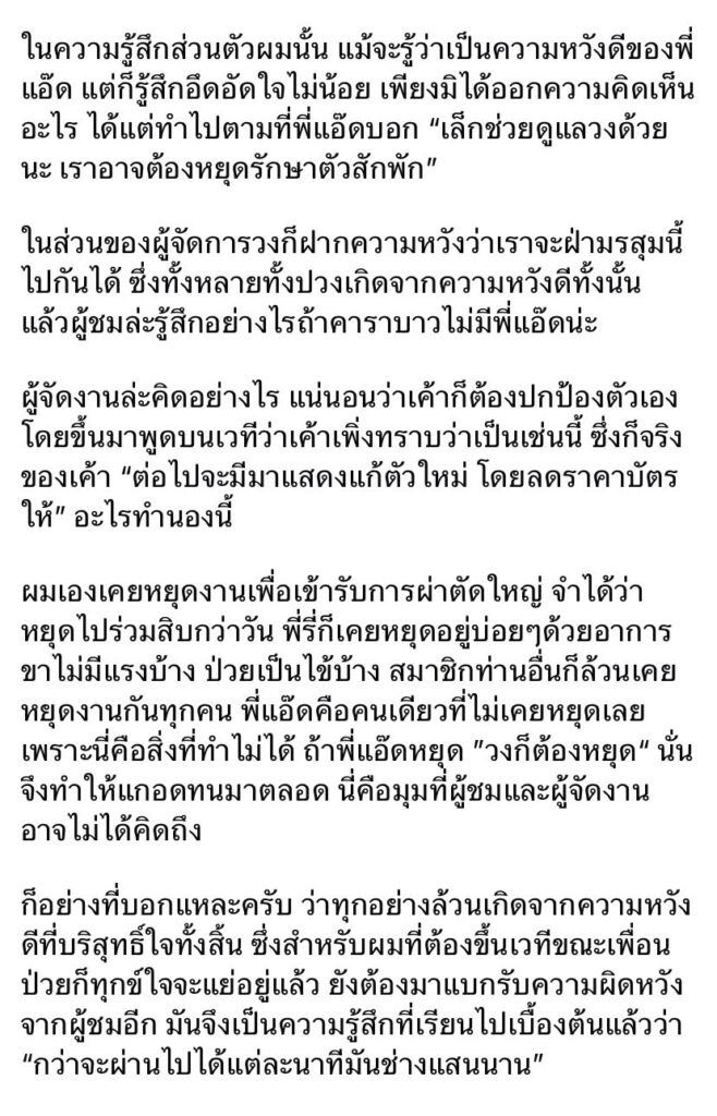 ในความรู้สึกส่วนตัวผมนั้น แม้จะรู้ว่าเป็นความหวังดีของพี่แอ๊ด แต่ก็รู้สึกอึดอัดใจไม่น้อย เพียงมิได้ออกความคิดเห็นอะไร ได้แต่ทำไปตามที่พี่แอ๊ดบอก “เล็กช่วยดูแลวงด้วยนะ เราอาจต้องหยุดรักษาตัวสักพัก”